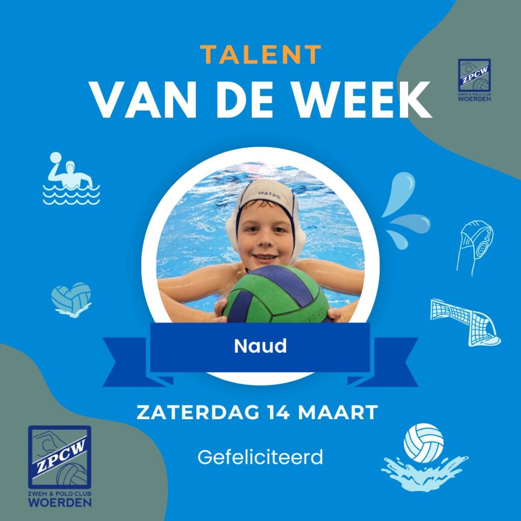 In 2024 herintroduceerden we het talent van de week. Iedere week zetten we één van onze jeugdleden in het zonnetje en is deze kleine waterpoloër eregast tijdens een wedstrijd van dames 1 of heren 1. De speler mag overal bij zijn. Van de voorbespreking tot de nabespreking, tijdens het inzwemmen, op de bank en natuurlijk mag de speler de bal samen met de scheidsrechter bij aanvang van de wedstrijd in het water leggen.